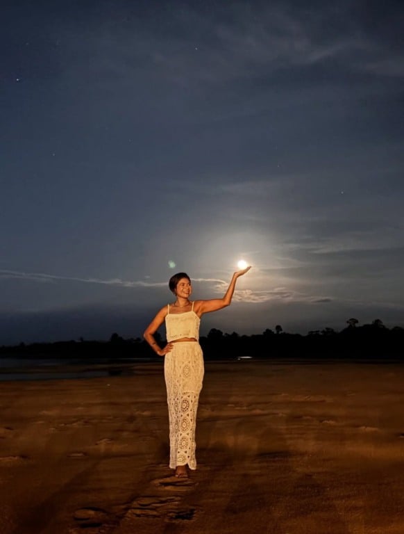 Amanda Bamberg em noite de luau às margens do rio 🌅. A consultora de imagem curtiu o clima leve, música e a tranquilidade do lugar 🎶. Um momento perfeito para relaxar e celebrar a beleza da Praia Grande 🌊.