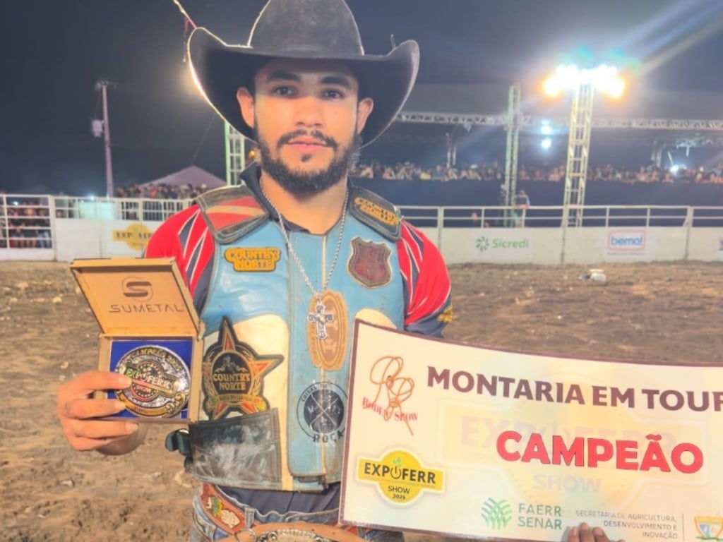 Finalizando as competições, o peão Natanael Zuqueto conquistou o título de campeão no rodeio, levando o prêmio e a fivela de ouro da Expoferr Show 2025.
