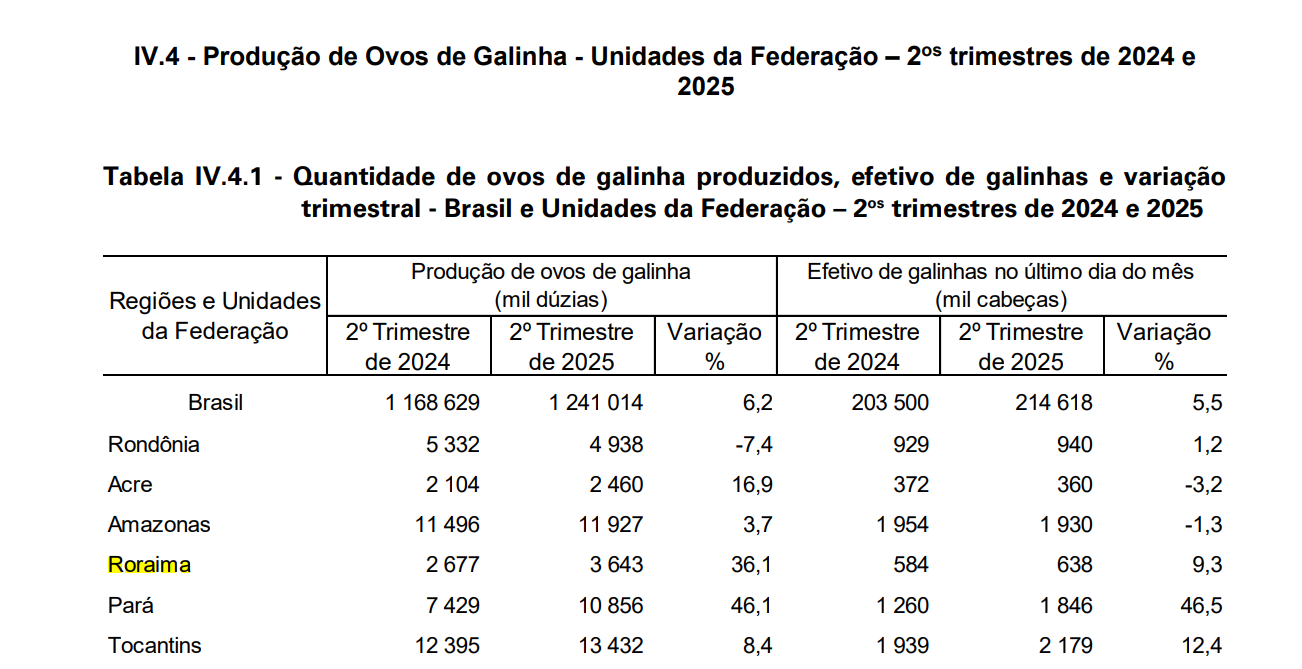 O levantamento integra a pesquisa Estatística da Produção Pecuária – 2º trimestre de 2025, e revela que o crescimento em Roraima foi seis vezes superior à média nacional, que ficou em 6,2%. Além do aumento na produção, o efetivo de galinhas também cresceu, passando de 584 mil para 638 mil cabeças, um avanço de 9,3%.