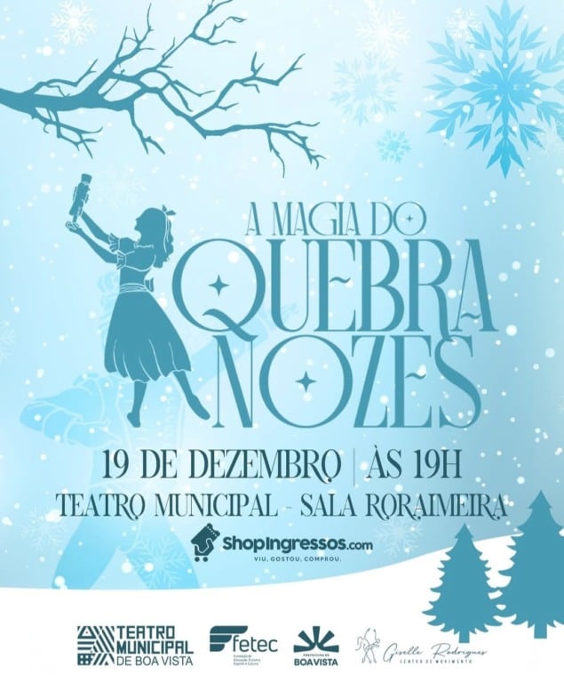 O Centro de Movimento realiza o espetáculo “A Magia do Quebra-Nozes”, uma releitura encantadora do clássico natalino ⭐️. A história de sonhos, coragem e fantasia ganha vida por meio da dança, reunindo crianças, jovens e adultos em um cenário cheio de encanto 🎄. Dia 19 de dezembro, às 19h, no Teatro Municipal – Sala Roraimeira.💫