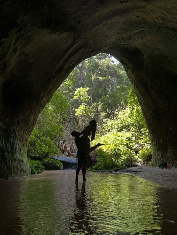 Jonas Silva e Taci Andrade na Caverna Refúgio do Maroaga, em Presidente Figueiredo (AM) 🌿. O casal curtiu cada momento em meio à natureza e ao clima de aventura 🏞️.