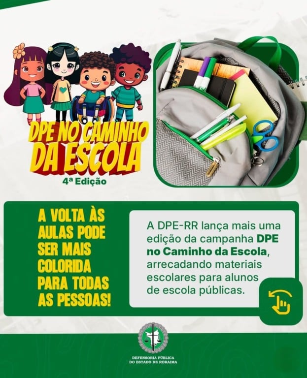 💚 A Defensoria Pública de Roraima deu início à campanha DPE no Caminho da Escola, que chega à sua 4ª edição arrecadando materiais escolares para apoiar crianças e adolescentes da rede pública. Podem ser doados cadernos, lápis, canetas, borrachas, apontadores e outros itens essenciais. Escolha o ponto de coleta mais próximo, separe os materiais e ajude a escrever um futuro melhor para muitas crianças. 📚🎒✏️