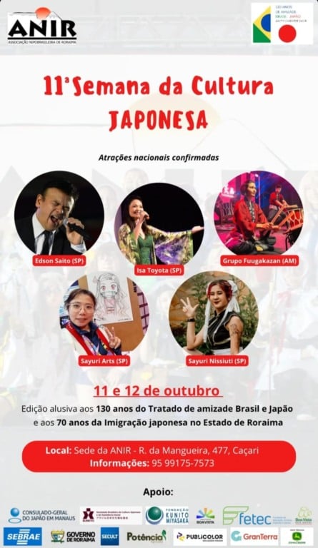 🎌 A 11ª Semana da Cultura Japonesa acontece nos dias 11 e 12 de setembro, com muitas novidades e atrações para todos os públicos! 🏯 Música, dança, culinária e arte oriental celebram os 130 anos do Tratado de Amizade Brasil-Japão e os 70 anos da Imigração Japonesa em Roraima. 🇧🇷🇯🇵 ⛩ Atividades gratuitas, exceto a parte culinária/gastronômica.