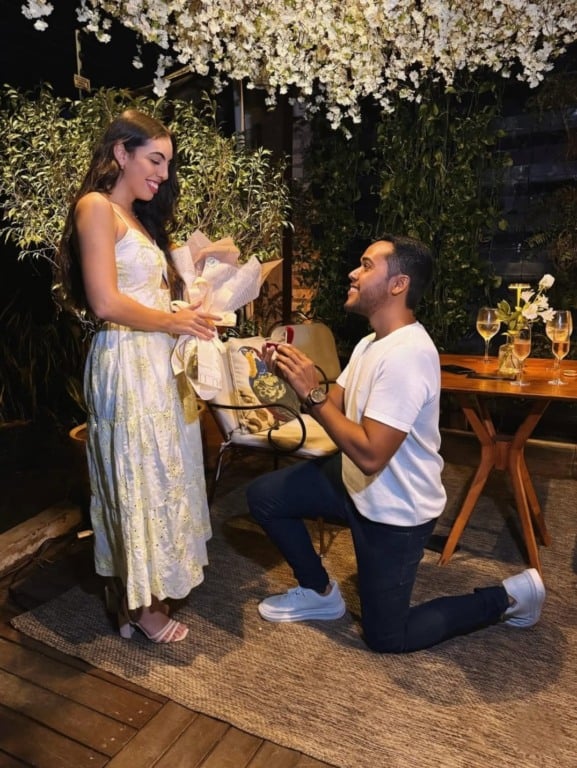 💍 Jéssica Amorim e Guilherme Barbosa estão noivos! 💖 O engenheiro elétrico pediu a mão da amada de forma super romântica, de joelhos, durante um jantar especial para a ocasião. 🕯️✨