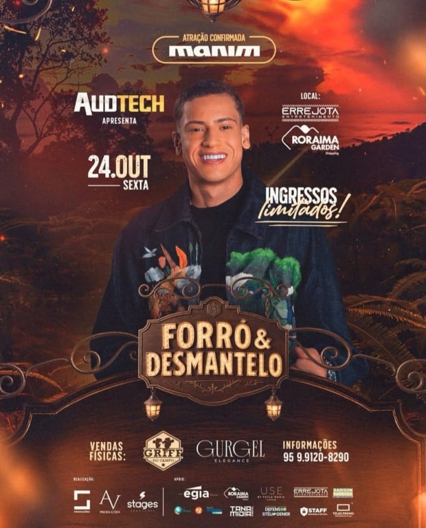 🐎 A Audtech apresenta o FORRÓ & DESMANTELO com Manim Vaqueiro ao vivo! 💥 O evento acontece nesta sexta-feira (24), no Errejota Entretenimento, localizado no Roraima Garden Shopping. 🎶 Prepare o chapéu para viver uma noite inesquecível de muito forró, alegria e desmantelo! 🌵💃