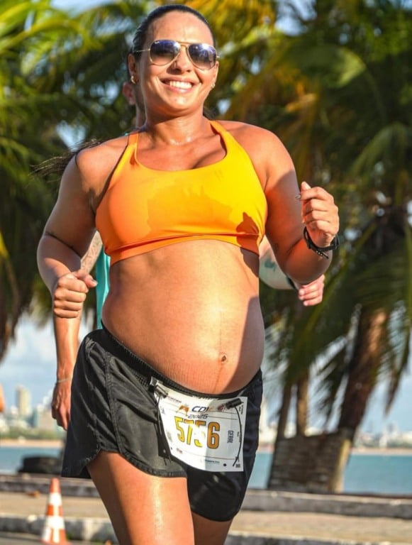 A maratonista, com 31 semanas de gestação, espera por Kaell e correu em Cabo Branco, em João Pessoa. Plena, ativa e esbanjando saúde nesse momento especial.