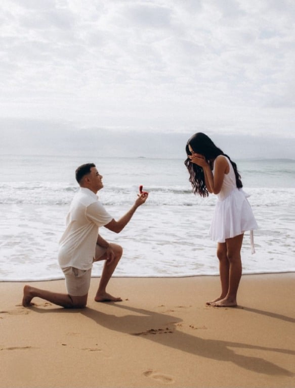 💍🌊Camille Ribeiro aceitou o pedido de casamento de Kaleb Santos durante uma viagem a Balneário Camboriú. Com direito a joelho no chão, fotógrafo registrando cada detalhe e o mar como cenário do sim.