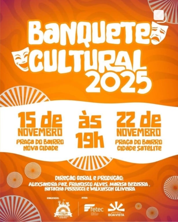 🎭 Vem aí o Banquete Cultural 2025. Nos dias 15 e 22 de novembro, o Fórum de Artes Cênicas de Roraima realiza a 4ª edição do evento, com cortejo e apresentações de dança, teatro, circo, música e performance a partir das 19h. As programações acontecem na Praça do Nova Cidade e na Praça do Cidade Satélite, reunindo artistas como Anne Louise e Banda, Milena Macuxi, Flechas Ministério da Dança, Cia Flow de Teatro e muitos outros.