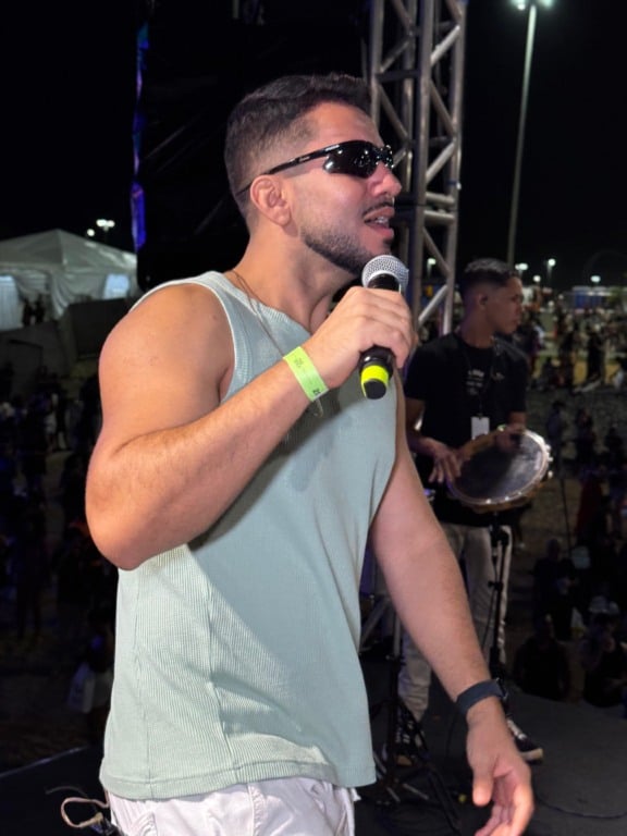 🎤 Tonny Lopes, vocalista do grupo Climatizando, já está afinando tudo para o evento “Vamo de Pagodin”. 🎶 A apresentação promete muita energia e samba no pé.