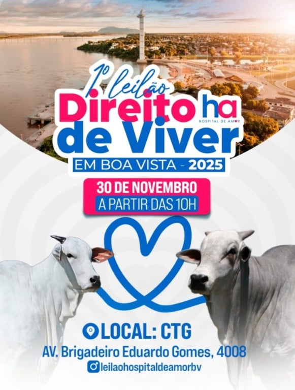 🎗️ Hospital de Amor realiza 1º Leilão “Direito de Viver” em Boa Vista. Com o objetivo de arrecadar recursos e fortalecer os tratamentos oncológicos, o evento acontece no dia 30 de novembro, às 10h, no CTG. 🐄✨ A população poderá participar disputando desde animais de grande porte até eletrodomésticos doados por parceiros e fazendeiros. As doações de brindes e produtos seguem sendo recebidas até a véspera do leilão. 💖