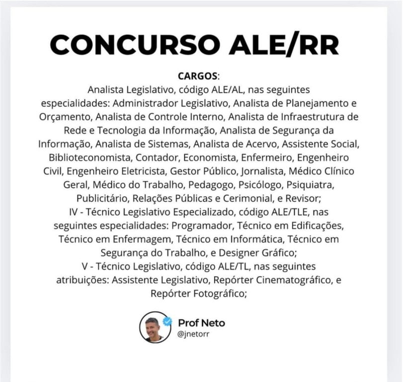 📢 Assembleia Legislativa de Roraima autoriza novo concurso público. A ALERR publicou, ontem (4), o Ato nº 088/2025, que abre seleção para cargos efetivos nos níveis superior, técnico e médio. 🏛️Entre os cargos de nível superior estão: Procurador, Consultor e Analista Legislativo (Administrador, Contador, Médico, Psicólogo, entre outros). No nível técnico, vagas incluem Técnico Legislativo Especializado (Programador, Técnico em Enfermagem) e Técnico Legislativo (Assistente Legislativo, Repórter Fotográfico). A publicação oficial está disponível no Diário Oficial da ALERR. 📄✅