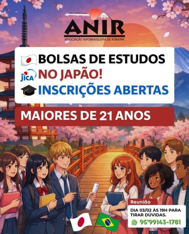 🌏🎓A ANIR, em parceria com a JICA, abriu inscrições para bolsas de estudo no Japão em diversas modalidades, destinadas a maiores de 21 anos e voltadas a quem busca oportunidades que podem transformar o futuro. Interessados podem participar de uma reunião online tira-dúvidas nesta terça-feira (03), às 19h, com link enviado por DM, para conhecer detalhes e escolher a bolsa ideal. ✨📚