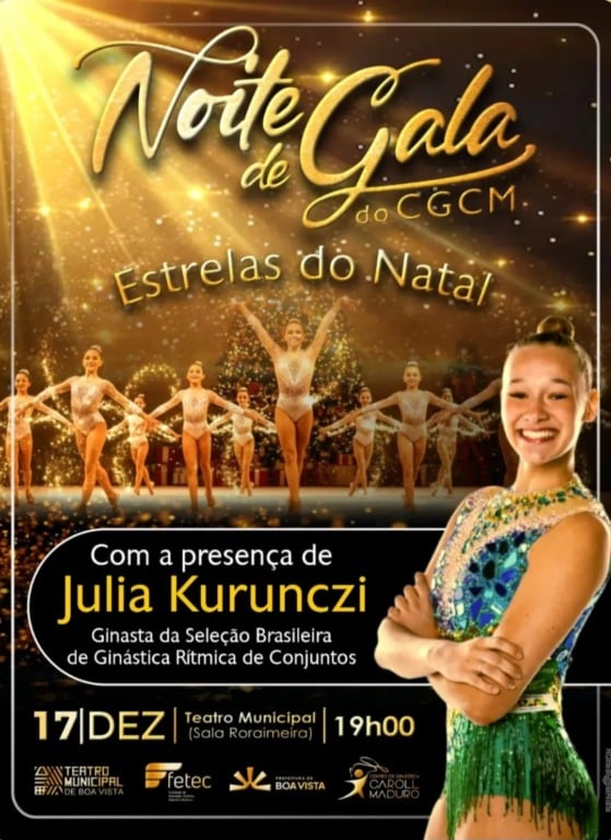 A Noite de Gala do Centro de Ginástica Caroll Maduro apresenta Estrelas do Natal, um espetáculo que promete encantar e emocionar 🎄✨. O evento contará com a participação especial da ginasta Julia Kurunczi, integrante da Seleção Brasileira de Ginástica Rítmica de Conjuntos 🤸‍♀️. A apresentação acontece no dia 17 de dezembro, às 19h, na Sala Roraimeira do Teatro Municipal 🎭💫.