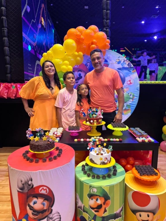 Andreza Mississipe e Davi Júnior celebrando o aniversário da filha  Pérola, juntamente com o filho Davi Mississipe