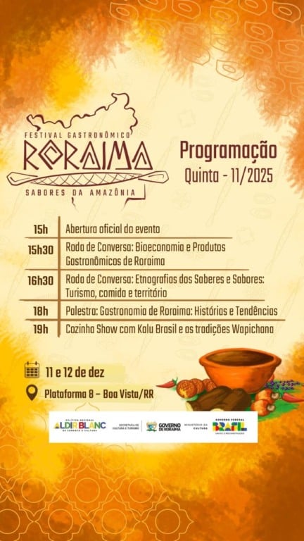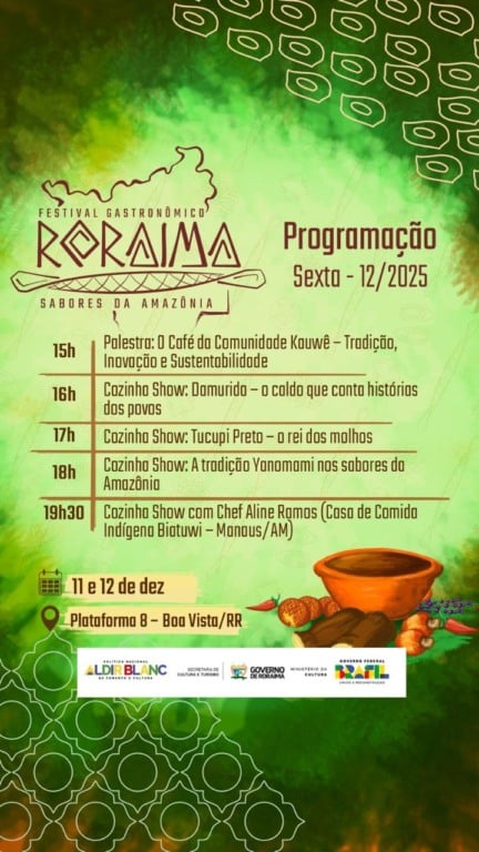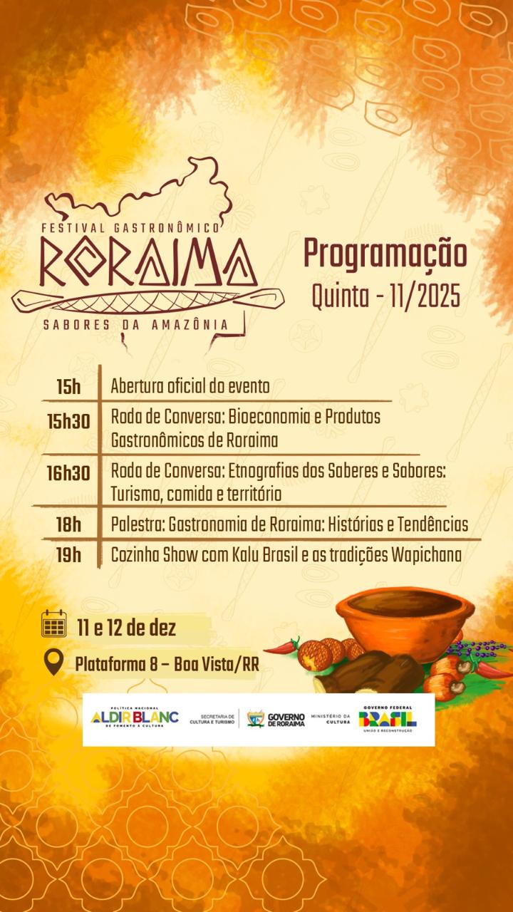 A programação do festival contempla rodas de conversa, aulas-show com chefs convidados e a exposição de empreendedores da bioeconomia, que apresentarão produtos de artesanato, gastronomia e serviços. Ao todo, serão 15 expositores, reunindo negócios que dialogam com a floresta, com os povos indígenas e com o território roraimense. As atividades têm como eixo central a valorização das culturas dos povos indígenas do Estado, evidenciando a cozinha como expressão de identidade, memória e pertencimento.