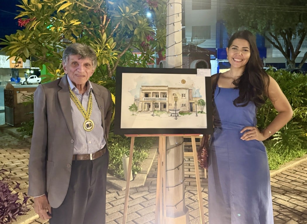 A artista Plástica Tafinis Said, durante exposição de seus trabalhos na Academia Roraimense de Letras. Na foto, ela divide clic com o acadêmico, Alcides Magalhães Lima