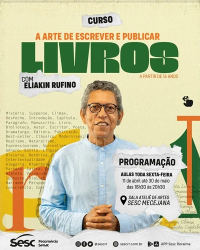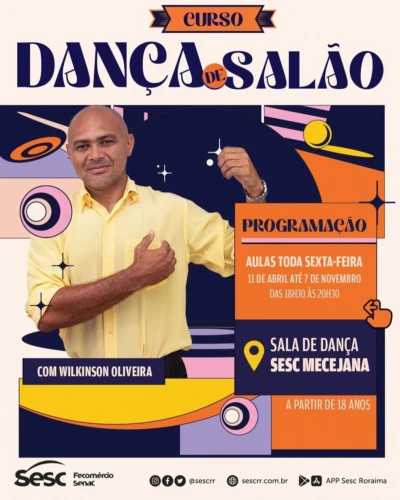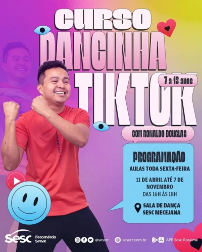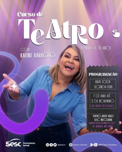 O Sesc-RR abriu inscrições para cursos de teatro, dança de salão, dancinhas do TikTok, produção de histórias em quadrinhos e formação de escritores. As matrículas podem ser feitas até o dia 04 de abril, na Sede Administrativa do Sesc, das 7h30 às 18h30, mediante a troca de 2kg de alimentos para trabalhadores do comércio, 3kg para empresários e 4kg para o público em geral. As aulas serão realizadas no Sesc Mecejana e terão como instrutores os especialistas Eliakin Rufino, Rhafa Porto, Kaline Barroso, Wilkinson Oliveira e Ronaldo Douglas.