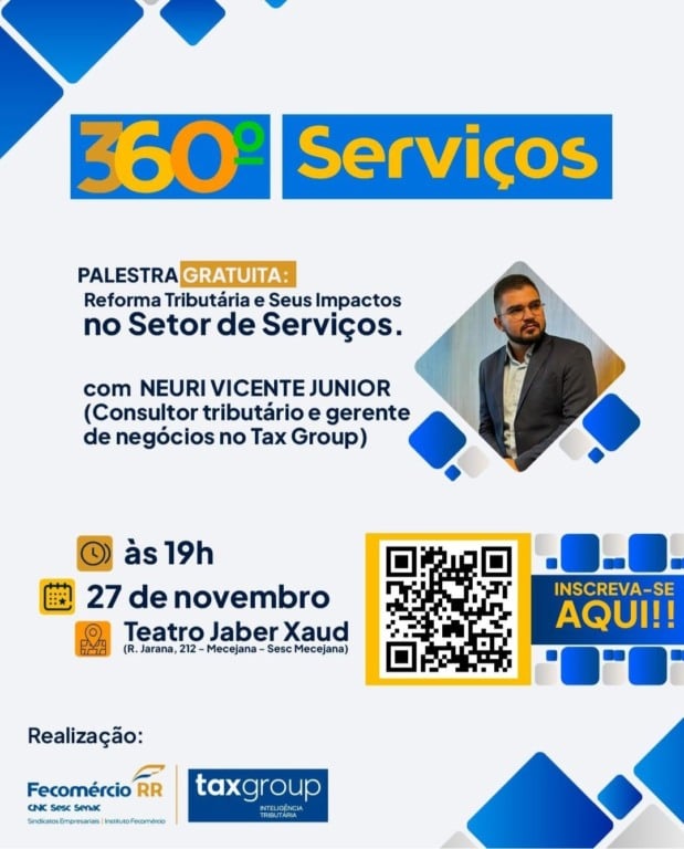 Para orientar empresários de comércio, serviços e turismo, a Fecomércio/RR, em parceria com a Tax Group, promove a palestra “Reforma Tributária e seus impactos no setor de Serviços” 🏢. Evento gratuito acontece na próxima quinta-feira (27), às 19h, no Teatro Jaber Xaud – Sesc Mecejana. Inscreva-se: link ✨.