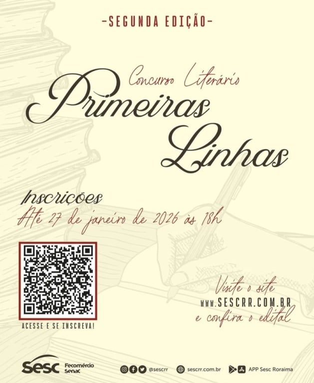 O Sesc-RR lança o concurso literário “Primeiras Linhas” para escritores e poetas iniciantes. ✍️Podem participar autores com até três livros publicados, enviando obras inéditas em Conto ou Poesia. 📝Os vencedores terão suas obras publicadas com tiragem inicial de 250 exemplares e participarão do lançamento na Semana Literária do Sesc Roraima. 📖O concurso busca revelar novos talentos e incentivar a produção literária local. 💫