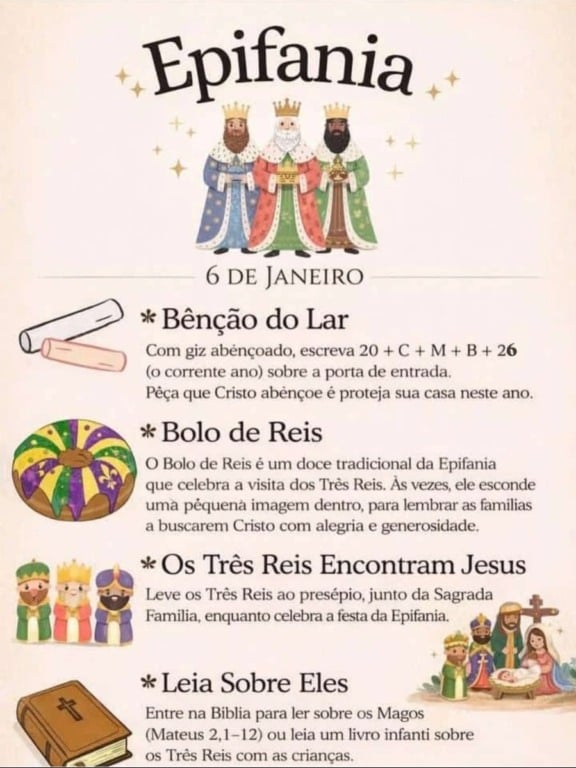 ✨👑 A Epifania, celebrada em 6 de janeiro, dia que celebra a visita dos Três Reis Magos ao menino Jesus, marcando o encerramento do ciclo natalino. 🕯️🙏 Entre as tradições estão a bênção do lar com giz abençoado, quando se escreve na porta a sigla do ano com as iniciais dos Reis Magos pedindo proteção para a família, e o tradicional Bolo de Reis, símbolo de partilha e união. 🍰⭐ A data também inspira o momento de reunir a família, levar os Reis ao presépio e retomar a leitura do Evangelho de Mateus, que narra a viagem guiada pela estrela, reforçando valores de humildade, generosidade e fé.