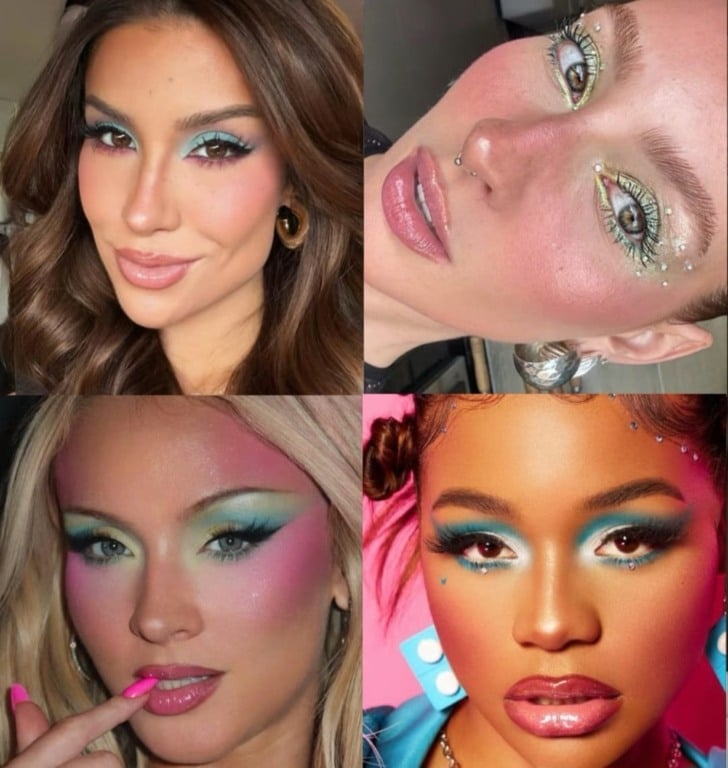✨💄 A maquiagem Y2K ganha força como tendência de 2026. A sigla vem de “Years 2000” e inspira um visual com muito brilho, gloss labial, sombras cintilantes e pele iluminada. Colorido, divertido e futurista, o estilo resgata os anos 2000 com um toque moderno. 💫