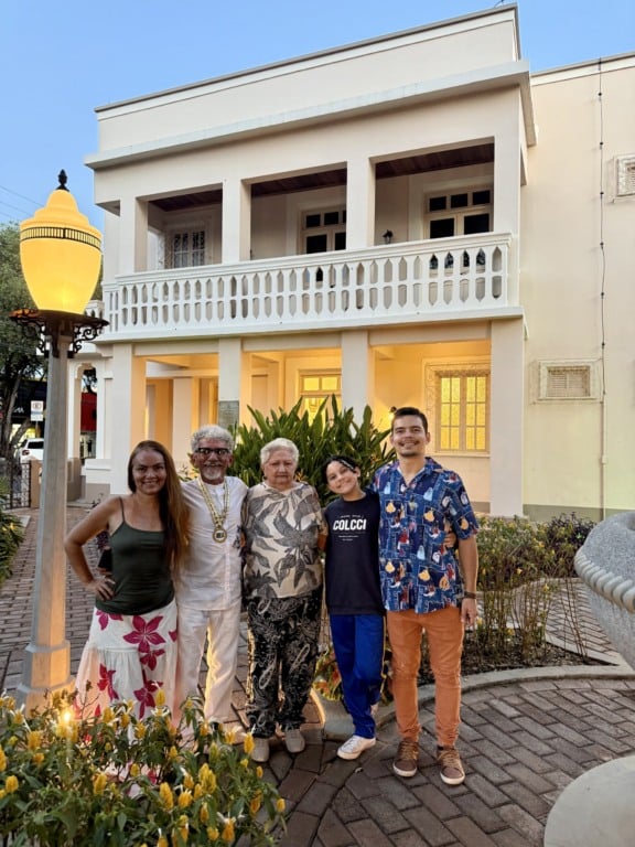 O cantor compositor Neuber Uchoa, com sua mãe, Suely Uchoa e seus filhos, Tauã, Taura e Carolina, recentemente na Casa da Cultura Madre Leotávia Zoller, sede da Academia Roraimense de Letras, entidade da qual o artista é membro vitalício titular