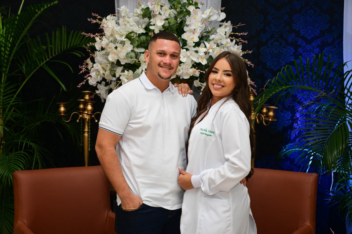 Nicolly Lorrana em sua cerimônia do jaleco 👩⚕️. A estudante de enfermagem posa radiante ao lado do amado Jackson Carvalho, compartilhando o orgulho desse momento especial ❤️.