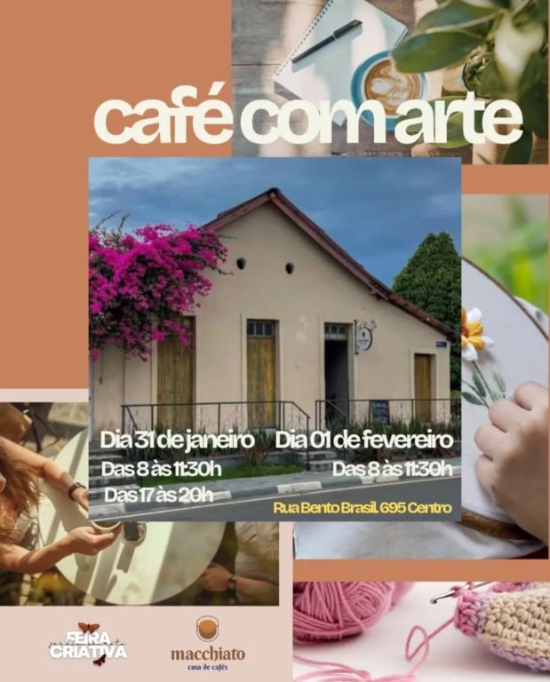 ✨🎨 Neste fim de semana, a Feira Criativa ocupa o Macchiato Café com uma programação que reúne artesanato, moda, gastronomia e música. No sábado (31), a feira acontece das 8h às 11h30 e retorna das 17h às 20h. Já no domingo (01), a visitação segue das 8h às 11h30. 🎶✨