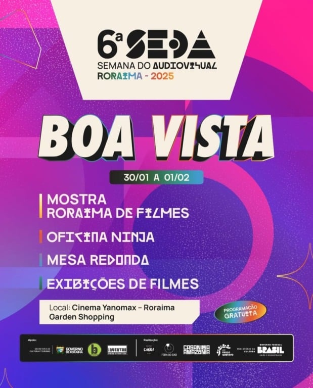 ✨🎬A Semana do Audiovisual de Roraima (SEDA-RR) chega à 6ª edição e movimenta Boa Vista de sexta (30) a domingo (01). A programação acontece no cinema Yanomax e no Roraima Garden Shopping, com oficinas, mesas redondas com convidados especiais e exibições gratuitas de filmes locais e nacionais. 🎞️🍿
