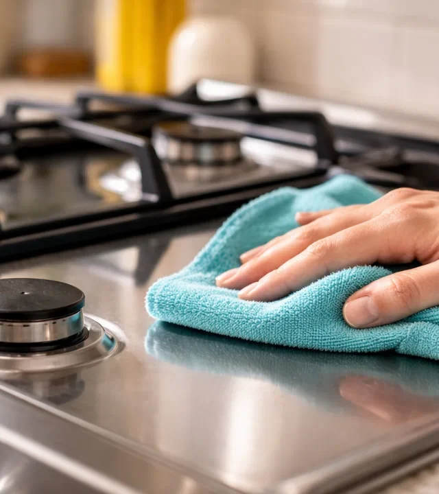 Depois de esfregar e enxaguar, muita gente termina a tarefa deixando o fogão “secar sozinho” ou usando qualquer pano disponível. Mas a umidade residual, somada a fiapos de pano inadequado, acelera a aderência de gordura e poeira — principalmente nas partes metálicas ou vitrificadas.