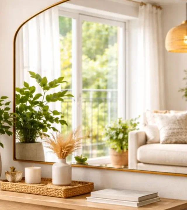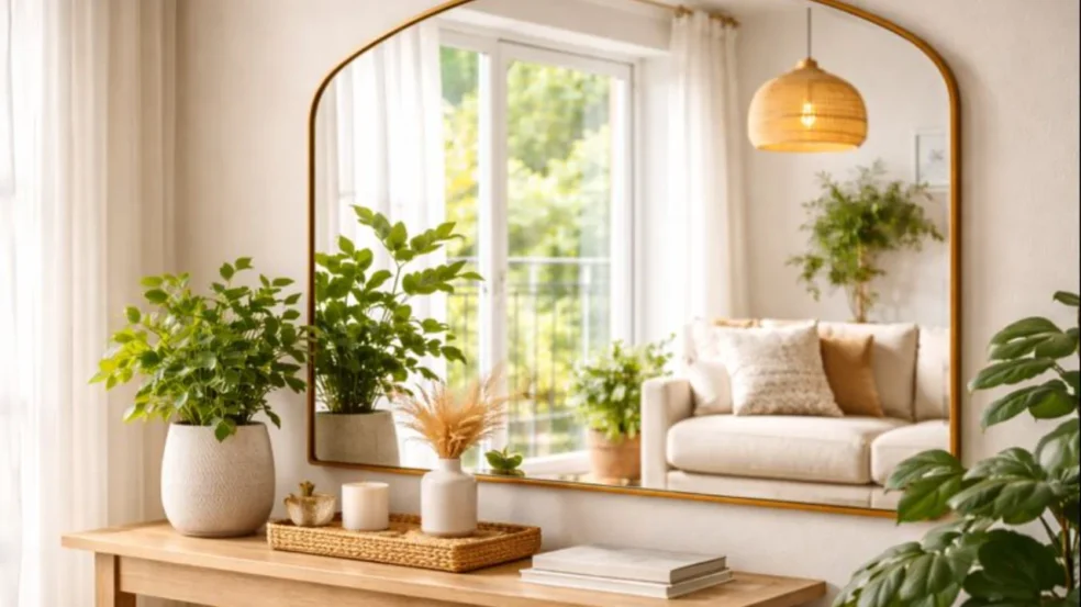 Quando o assunto é melhorar a energia do espaço, o primeiro passo é observar onde entra a luz natural. Posicionar um espelho de frente ou em diagonal para janelas faz com que a claridade se espalhe pelo ambiente, deixando tudo mais iluminado e, consequentemente, mais leve. Essa sensação de luz ajuda a afastar o ar carregado de certos cantos e reforça uma atmosfera de bem-estar. Além disso, a duplicação visual dos elementos cria profundidade, dando a impressão de cômodos maiores e mais abertos.