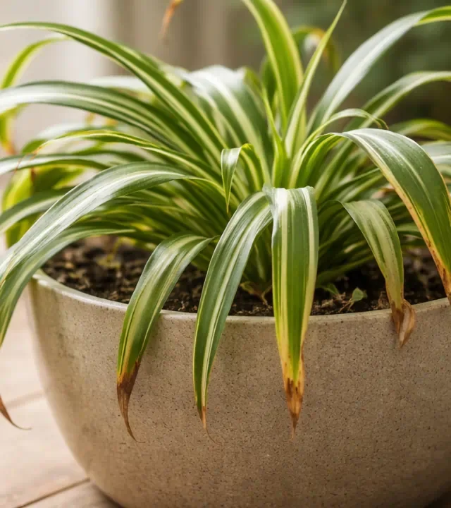 Esse pequeno atraso na rega pode não matar o clorofito, mas funciona como um gatilho para uma reação em cadeia. O primeiro sinal visível é o amarelamento das folhas mais velhas, seguido pelo ressecamento nas bordas. Em casos mais avançados, a planta começa a parar de emitir novas brotações — uma forma de poupar energia.