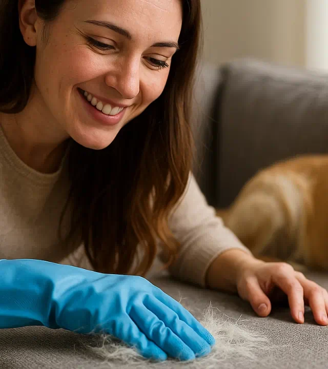 A técnica consiste em usar uma luva de borracha — daquelas comuns de limpeza — para retirar os pelos dos tecidos. Basta vestir a luva, umedecê-la levemente com água e passar sobre a superfície onde os pelos estão grudados. O atrito gerado cria uma leve eletricidade estática que atrai os fios soltos, fazendo com que eles se agrupem e sejam facilmente removidos com a mão ou um pano úmido.