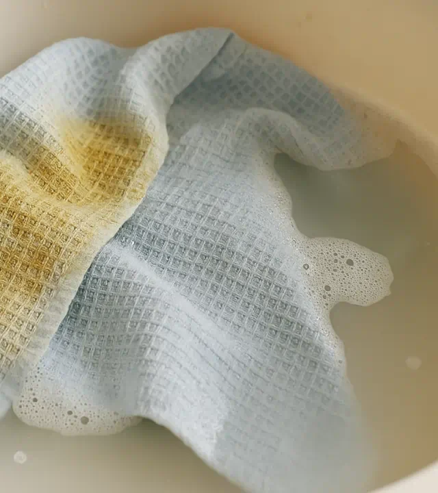 Mergulhe os panos de prato nessa mistura e deixe agir por 10 minutos. Depois, esfregue levemente e enxágue com água fria.