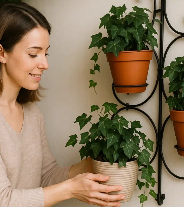 Os vasos de cerâmica ou fibra natural são ótimas escolhas, pois ajudam na drenagem e realçam o tom verde das folhas. Uma dica extra: combine a Hedra com outras plantas pendentes, como jiboia ou samambaia, para criar um arranjo dinâmico e cheio de movimento.