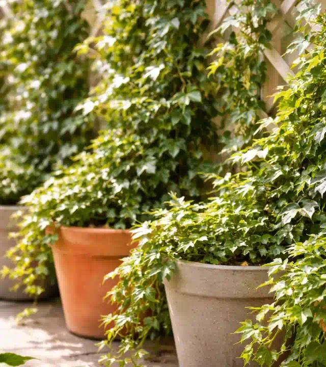 A dica de ouro: usar guias ou treliças entre os vasos. Com isso, os galhos da hera vão se conectando de forma natural, criando o efeito de “manta vegetal” contínua, mesmo que cada vaso esteja separado.