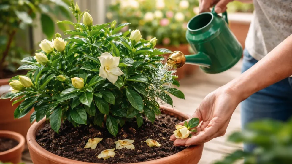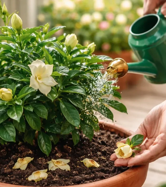 O erro mais comum ocorre quando a planta passa por um período mais seco e, de repente, é encharcada. Esse choque hídrico confunde o sistema da gardênia, que entende a mudança como um risco e opta por abortar os botões para se preservar. A gardênia é uma planta que valoriza estabilidade: ela não gosta nem de solo seco demais, nem de solo excessivamente úmido. Alterações súbitas fazem com que os botões — ainda imaturos e frágeis — sejam os primeiros a cair.