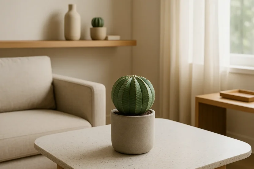 Apesar do nome curioso, a suculenta beisebol — oficialmente conhecida como Euphorbia obesa — conquistou decoradores por sua forma esférica, quase simétrica, e sua textura discreta, que lembra uma pequena escultura viva. Ela exige pouca manutenção, se adapta bem a espaços internos e oferece um efeito visual elegante sem roubar a cena.