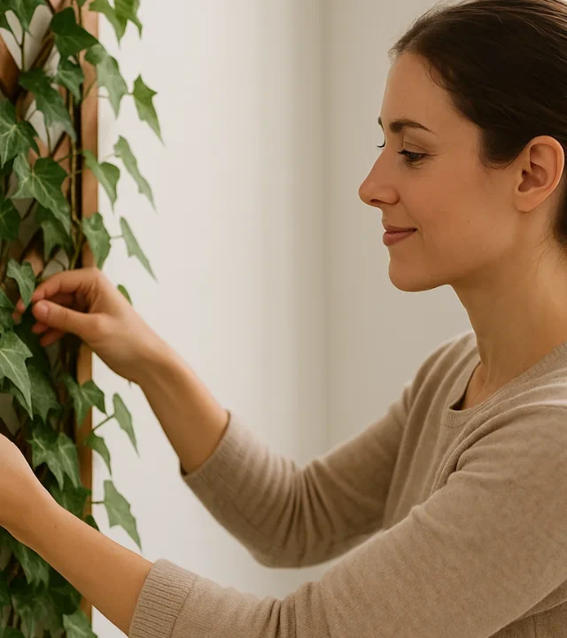 Para ter hera inglesa dentro de casa com segurança, o primeiro passo é criar uma estrutura de apoio. Nunca deixe a planta fixar-se diretamente na parede — o ideal é usar treliças, suportes de ferro ou painéis de madeira tratada. Esses elementos servem como barreira de proteção e ainda dão um acabamento sofisticado ao ambiente.