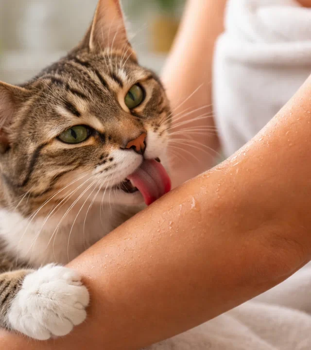 Na maioria dos casos, quando os gatos lambem o dono depois do banho, o gesto é positivo. Indica confiança, proximidade e reconhecimento social. É o equivalente felino a um carinho silencioso.