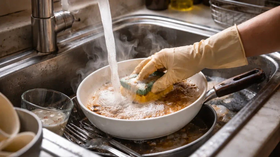 A gordura não é o único inimigo da limpeza da cozinha. Resíduos de amido, como massas e arroz, também grudam e endurecem nas panelas. Nesse caso, o segredo está em deixar de molho com água quente por pelo menos 10 minutos, o que amolece a sujeira e facilita a remoção.