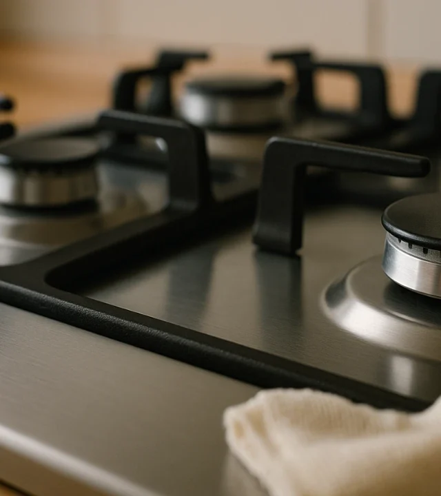 Não tem segredo. Comece com a limpeza tradicional: água morna, sabão neutro e uma esponja macia. Remova todos os resíduos visíveis e seque bem a superfície. Em seguida, misture duas colheres de sopa de amaciante com meio copo de água, umedeça um pano macio nessa solução e passe sobre toda a área do fogão — bocas, inox, laterais, mesa e até o vidro do forno.