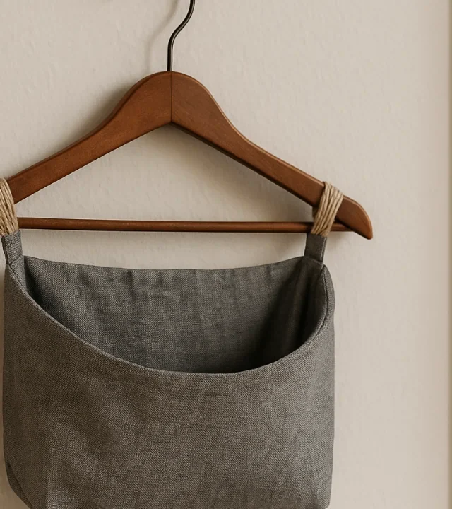 Escolha um tecido resistente, como brim, sarja ou algodão mais grosso. Dobre ao meio, criando um fundo, e costure ou cole as laterais com cola quente. Depois, basta prender as duas extremidades superiores ao cabide, enrolando ou amarrando com barbante, elástico ou até com o próprio tecido. O resultado é um organizador suspenso, com estrutura firme e visual leve.