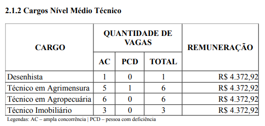 Já para o nível médio e técnico, o processo seletivo contempla os cargos de Desenhista, Técnico em Agrimensura, Técnico em Agropecuária e Técnico Imobiliário, com salário de R$ 4372,92.
