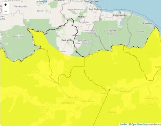 O alerta inclui áreas da capital Boa Vista e municípios do interior, e faz parte de uma extensa área de instabilidade que também alcança outros estados das regiões Norte e Nordeste do país. Para o sul do estado, a previsão indica a ocorrência de chuvas próximas de 5 mm.