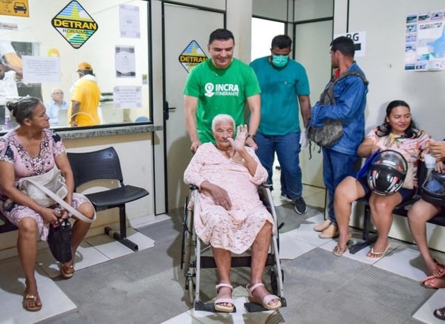 Residente do assentamento Jatapu, a idosa foi transportada de ambulância até o Centro de Referência de Assistência Social (Cras), onde ocorre a ação. A mobilização foi organizada por servidores do Cras, do Incra e da Secretaria Municipal de Saúde para garantir que ela tivesse acesso ao serviço. O atendimento foi realizado em cadeira de rodas e acompanhado de perto pela filha, Maria dos Anjos.