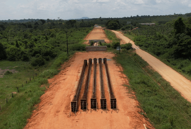 Com exceção da ponte sobre o Rio Caroebe, que permanece na etapa inicial com implantação de desvios, as demais frentes registram avanço. Foram concluídos serviços de aterro, construção de desvios, armação passiva e instalação de cordoalhas de protensão. Também está finalizado o Bueiro Triplo Celular de Concreto, responsável pela drenagem e pelo escoamento de água no local.
