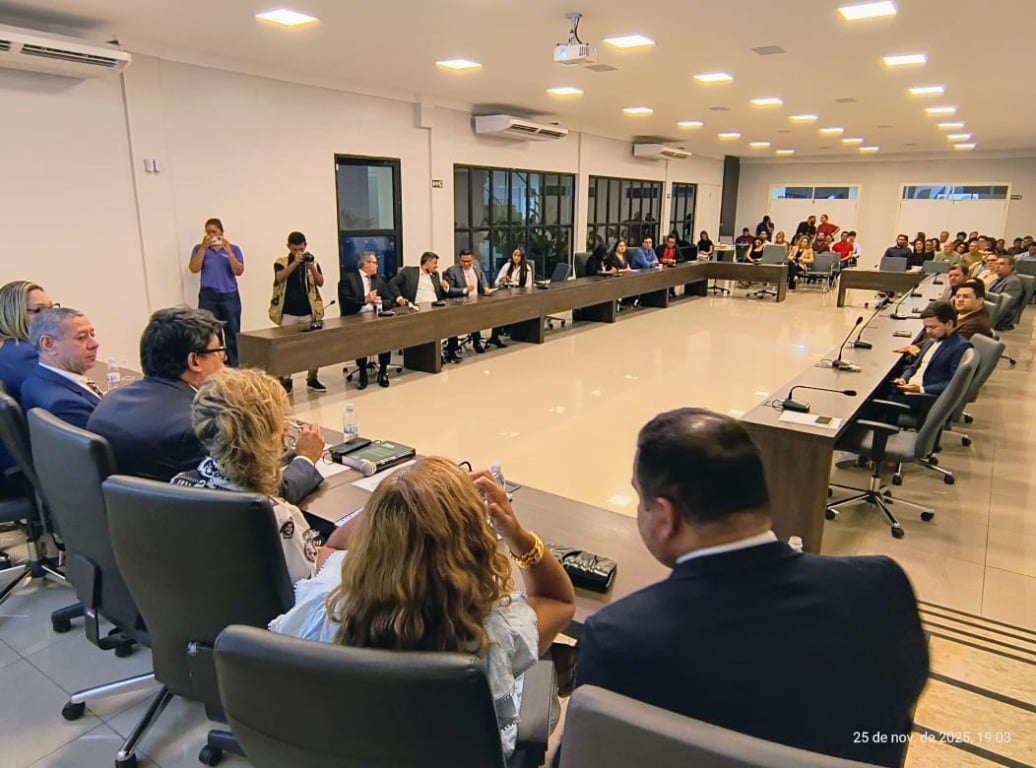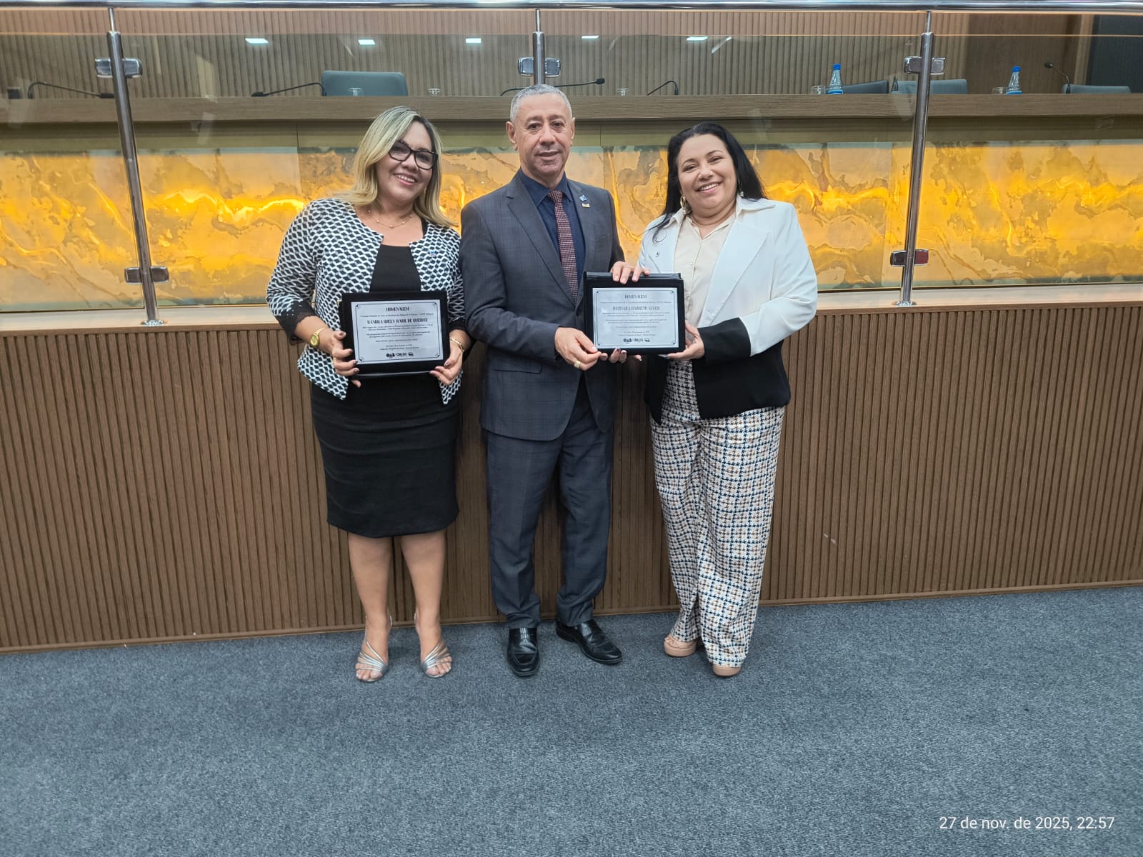 Ao final das palestras, o presidente Ednaldo Vidal entregou uma placa comemorativa dos 46 anos da Seccional à vice-presidente da OAB-RR, Dra. Natália Leitão, à presidente da CAA-RR, Dra. Sandra Raiol, e à presidente da Escola Superior da Advocacia de Roraima (ESA-RR), Dra. Rozinara Barreto, em reconhecimento pelo protagonismo profissional e pelo zelo na defesa das prerrogativas da advocacia.