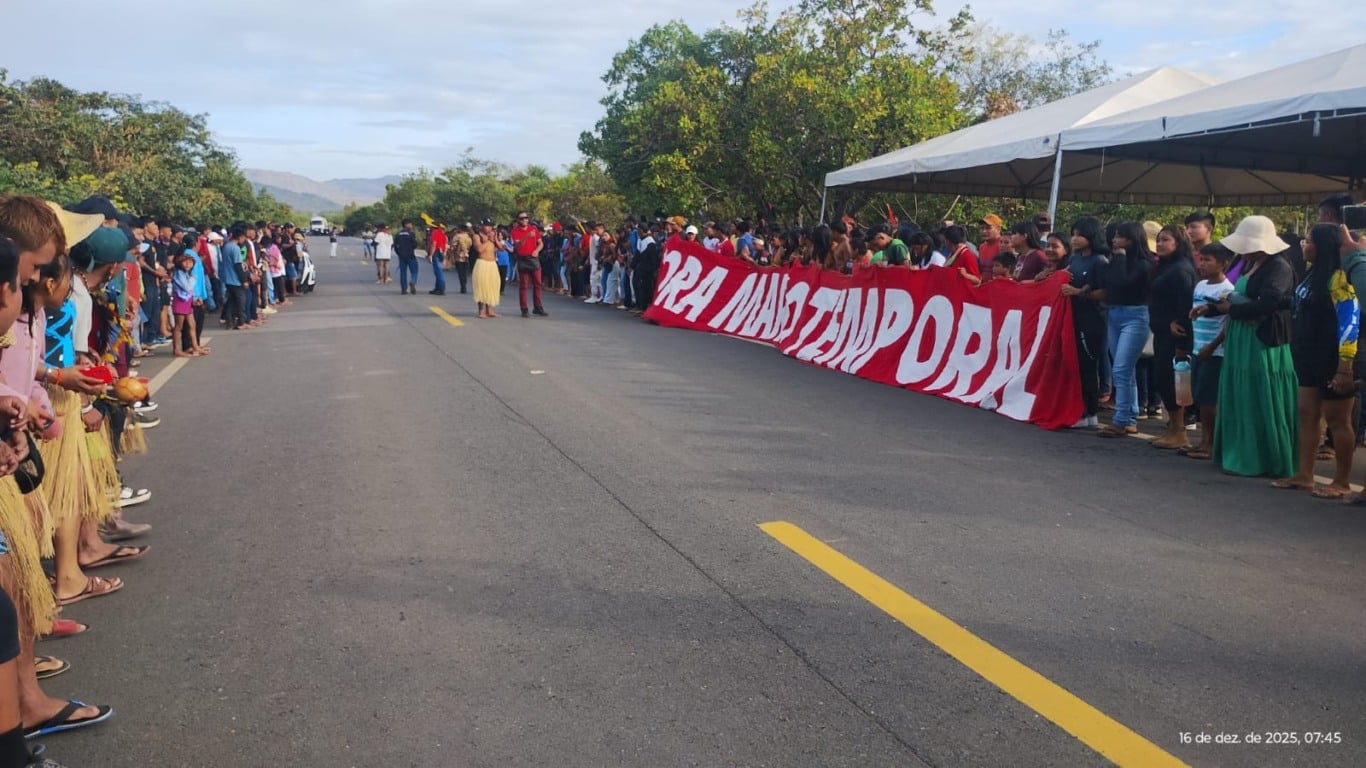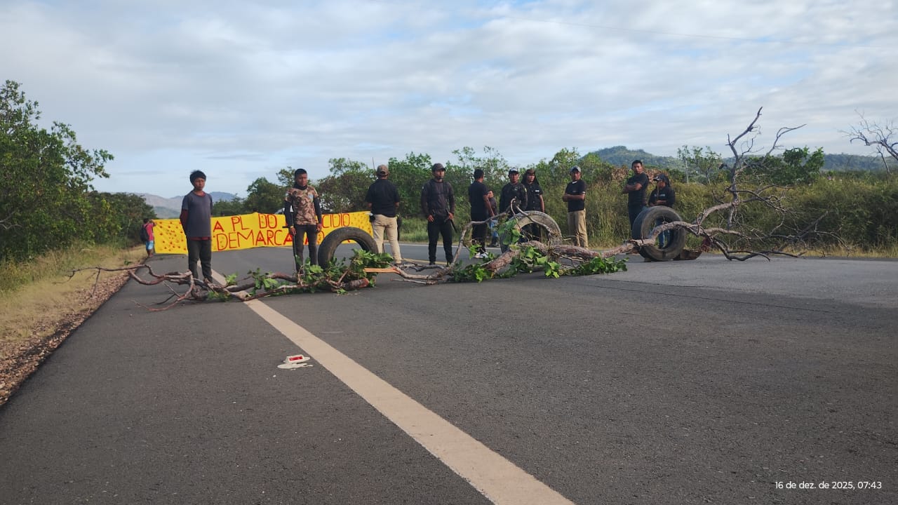 Indígenas voltaram a bloquear, nesta terça-feira (16), a BR-174, no município de Pacaraima, em frente à comunidade indígena Sabiá, em protesto contra a Proposta de Emenda à Constituição (PEC) 48/2024, aprovada pelo Senado no dia 9 de dezembro, que inclui o Marco Temporal na Constituição Federal.