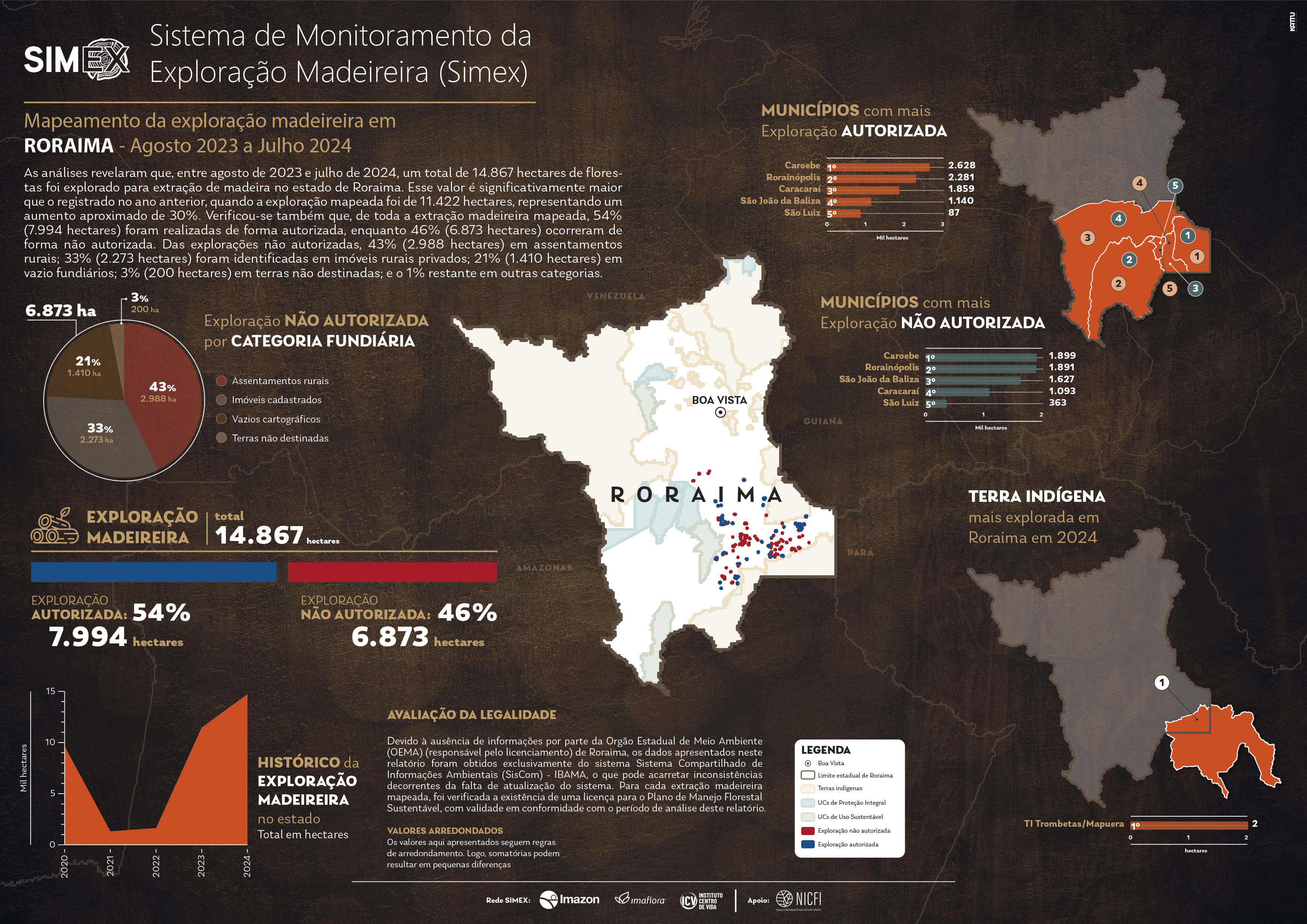 Dados do Sistema de Monitoramento da Exploração Madeireira (Simex) revelam que, entre agosto de 2023 a julho de 2024, 46% da extração madeireira em Roraima ocorreu de forma ilegal, totalizando 6.873 hectares de floresta explorada sem autorização dos órgãos ambientais. Essa área corresponde a mais de seis mil campos de futebol.